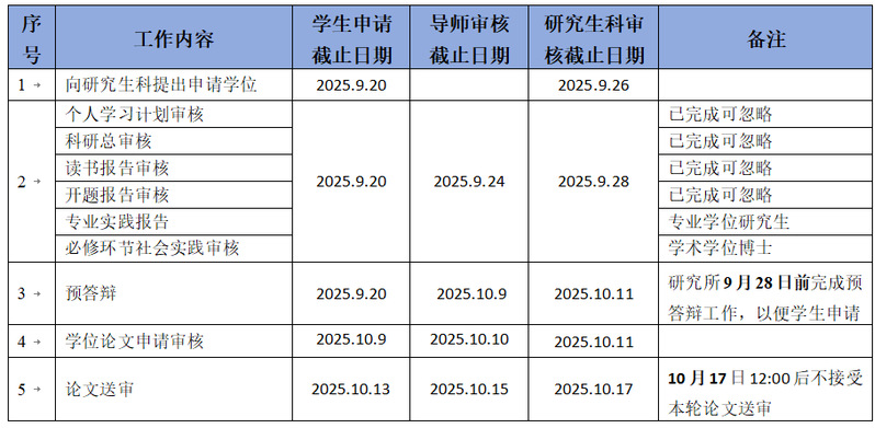 要求2025年12月10日前完成答辩,12月15日上午9:00-11:30、下午1:30-4:30提交相关材料至研究生科。请各位同学把握好论文质量和终稿上传时间。毕业生登记表联系学院团委,其他材料联系研究生科。