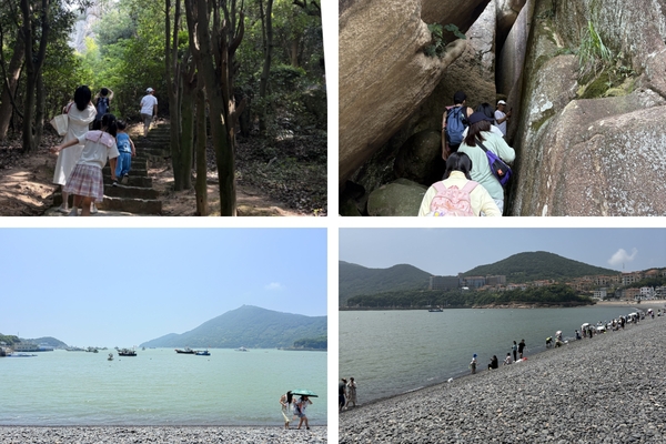 次日清晨,用过早餐后,疗休养团一行前往朱家尖核心景区开启游览。首站来到白山景区,高达69米的观音壁画气势恢宏,灵鹫峰、天缝台、八戒望海等奇峰怪石形态各异,大家驻足观赏、拍照留念,感受自然造物的神奇。随后教职工们前往乌石塘景区,乌黑发亮的鹅卵石沿坡铺就,海浪拍打石滩发出独特的“乌塘潮音”,浓郁的渔家风情扑面而来,教职工们在此聆听潮声、畅谈生活。下午,众人来到朱家尖“十里金沙”中最负盛名的南沙景区。这里沙粒纯净细腻,是舟山国际沙雕节的举办地。大家漫步沙滩、远眺碧海蓝天,听潮起潮落、观海天一色,尽情拥抱海洋的辽阔与壮美。