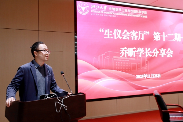 2025年11月28日下午,生仪学院品牌育人项目“生仪会客厅”第十二期活动在玉泉校区周亦卿楼一楼报告厅顺利举办。本次活动以“医疗AI时代的使命与担当”为主题,特邀学院1986级生物医学工程与仪器专业校友、深睿医疗联合创始人乔昕学长作分享。学院党委副书记、纪委书记陈辰星老师,学生辅导员鲍俊威老师,发展联络专员陶承荣、杨丹老师及七十余位学生代表参加活动。活动由生仪学院生物医学工程专业本科三年级学生徐畅主持。