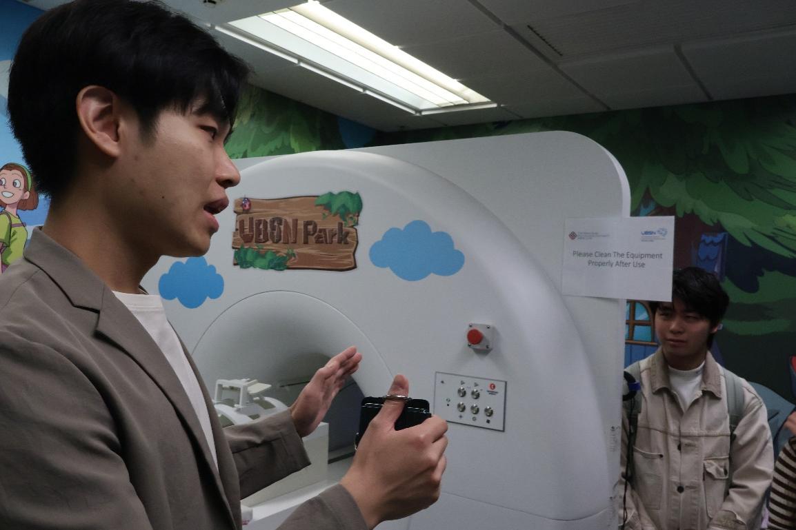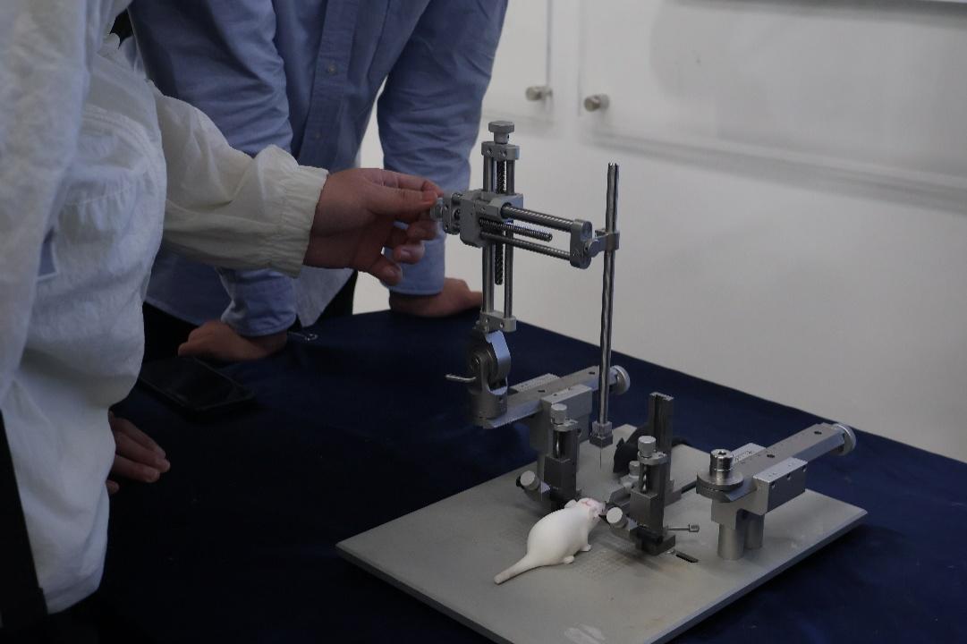 在神经科学中心实验室,Yeung博士详细讲解了关键仪器——脑立体定位仪的结构和定位原理与用途。随后,同学们在模拟标本上进行了实操练习,掌握了颅骨定位、坐标校准等关键步骤。此外,实验室还配备了模拟MRI设备,并向同学们介绍了其对儿童适应MRI噪声的作用。最后,实验室成员向访学团系统讲解了EEG(脑电图)、经颅磁刺激(TMS)、经颅直流电刺激(tDCS)三项技术,并请同学代表参与了脑电测量并深入地讲解了EEG测量原理,还回答了同学们信号处理相关的问题,使得课内的知识和前沿的拓展有机地结合了起来。