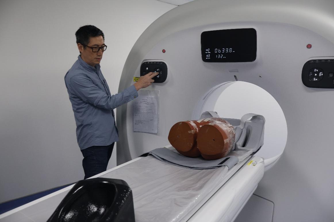 王教授首先介绍了X光机的核心组件、工作机制及操作流程,并使用手机为同学们演示了X光的拍摄效果。之后,王教授讲解了X光机在临床使用中的各项要点,如拍摄不同部位时需要将设备调整至什么角度等,让同学们对临床应用有了新的理解。最后,王教授展示了CT设备的使用流程,并通过模拟标本演示了其影像能力。在演示期间,王教授强调了影像设备的辐射防护标准与操作安全规范,让访学团同学对放射检查的安全规范有更加深刻的理解。