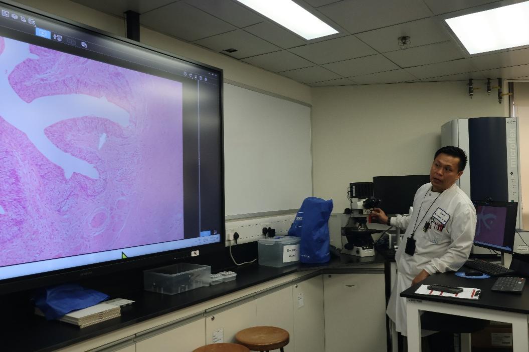系实验室高级科学主管许建熙博士带领访学团参观了医疗科技及资讯学系的教学实验室。学系有数量众多,功能齐全的生物类教学实验室。每个实验室能容纳60名学生同时进行实验,两个实验室间,可以进行视讯互通辅助教学。在切片实验室,许博士向同学们讲解了切片机、冷冻切片机的主要结构和用途。同学们也在许博士的指导下,上手体验使用冷冻切片机进行切片操作。而在细胞观察的教学实验室,可以看到该实验室中的显微镜都与实验室主机相连,教师可以在讲台上通过主机检查每一名学生的成像结果,并通过投影设备展示给全班。此外,许博士还向同学们展示了教学实验室中的各类医学检验仪器、超净工作台等设备。
