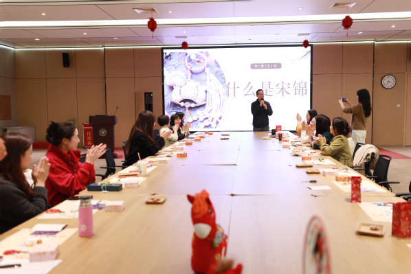 本次活动以宋锦手工制作为核心,为女教职工们搭建了亲近非遗的平台。作为中国三大名锦之一,宋锦素有“锦绣之冠”的美誉,其历史可追溯至北宋末年,距今已逾千年。2006年,宋锦织造技艺被列入第一批国家级非物质文化遗产名录,2009年又作为中国传统桑蚕丝织技艺的重要组成部分,入选联合国教科文组织人类非物质文化遗产代表作名录。宋锦以天然染料染色,经三十余道复杂工序织造而成,纹样对称严谨却不失灵动,色泽典雅和谐,兼具细腻肌理与东方美学韵味,自古便是宫廷服饰、书画装帧的珍品,如今更成为承载千年文脉的文化符号。
