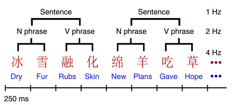 Experiment design: Sequences of Chinese or English monosyllabic words were presented isochronously, forming phrases and sentences.