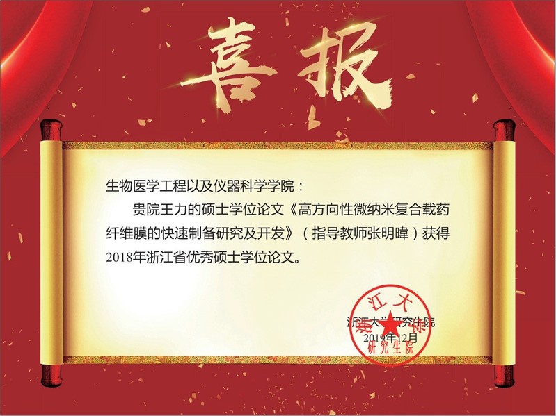 Your student Wang Li with his master’s thests, Rapid Preparation and Development of High Directional Micronanometer Composite Drug-carrying Fiber Membrane (Under the instruction of Associate Prof. Zhang Mingwei), has been awarded Excellent Master’s Thesis of Zhejiang Province in 2018.