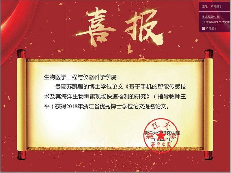 Your student Su Kaiqi with his doctoral dissertation, Research on Intelligent Sensing Technology Based on Mobile Phones and Rapid Field Detection of Marine Biotoxins (Under the instruction of Prof. Wang Ping), has been awarded Nomination for Excellent Doctoral Dissertation of Zhejiang Province in 2018.