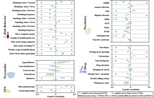 To determine the neural structural basis of these two factors, the study calculated the genetic correlations between them and 408 structural neuroimaging phenotypes. For brain structure, the study found a significant link between white matter microstructure and processing speed but not accuracy. Cortical regions associated with visual processing were linked to speed, likely due to the visual nature of the tasks used in the study. In contrast, areas involved in higher cognitive functions, such as the anterior cingulate cortex and insula, were associated with processing accuracy (Fig.2). Additionally, the study computed genetic correlations between these two factors and various life behaviors, revealing that certain behaviors--such as smoking, alcohol consumption, sleep status, and some mental disorders—had significant genetic correlations with both factors (Fig.3).